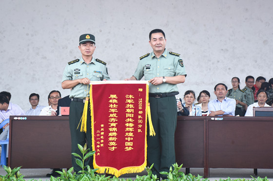 随后,军训阅兵暨总结汇报大会开始。陈兴荣在魏儒飞少校、田发东上尉的陪同下检阅方阵,向75310部队90分队赠送锦旗。