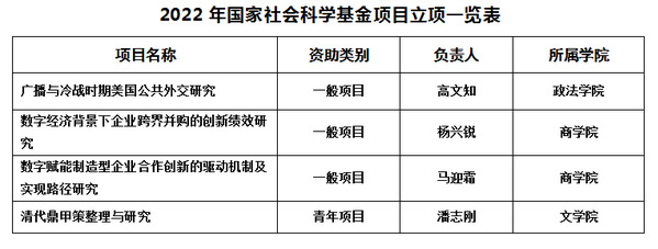 本网讯 近日,国家自然科学基金委员会、全国哲学社会科学工作办公室公布了2022年国家自然科学基金项目和国家社会科学基金项目评审结果,我校共有8项课题获得立项。此前,国家艺术基金管理中心公布了国家艺术基金(一般项目)2022年度资助项目名单,我校1个项目获得立项。截至目前,本年度我校共有9个国家基金项目获准立项。