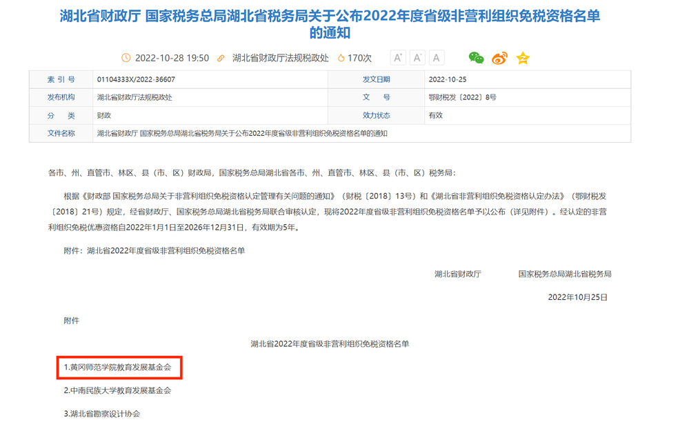 近日,湖北省财政厅、国家税务总局湖北省税务局公布《2022年度省级非营利组织免税资格名单》的通知,黄冈师范学院教育发展基金会(以下简称基金会)取得湖北省2022年度省级非营利组织免税资格(有效期为五年)。这是基金会首次通过此项认定,也是基金会继年初荣获湖北省2021年度全省性社会组织评估“4A”等级以来的又一重大喜讯。