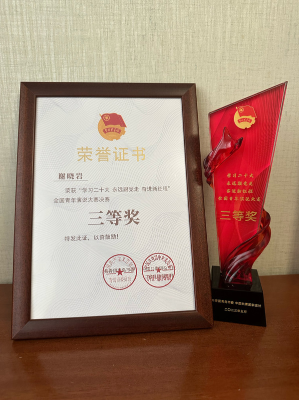 本网讯 用青春声音讴歌时代,让青春故事绽放光彩。5月3日下午,由共青团青岛市委、中国共青团杂志社共同举办的“学习二十大永远跟党走奋进新征程”全国青年演说大赛决赛在青岛广播电视台800平米演播大厅举行。我校学子谢晓岩在大赛中荣获三等奖、最佳风采奖。