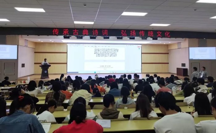 本网讯 为弘扬中华优秀传统文化,提高青年学生对古典诗歌的鉴赏、阅读和写作水平,10月26日,学校联合黄冈市诗词学会(东坡赤壁诗社)在北区学术报告厅举办诗词文化进校园及诗教活动,市诗词学会会长(东坡赤壁诗社社长)王建明出席活动,市诗词学会原副会长卢建平作了《浅谈中华诗词入门》专题讲座。