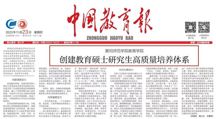 《中国教育报》11月23日第07版(高校新风)以《创建教育硕士研究生高质量培养体系》为题,从“向管理要活力”“向质量要定力”“向文化要动力”三个方面报道了我校教育学院在教育硕士研究生培养的关键环节精准发力,构建了具有浓郁校本特色的教育硕士研究生教育体系,取得显著成效。