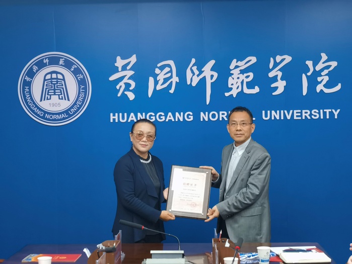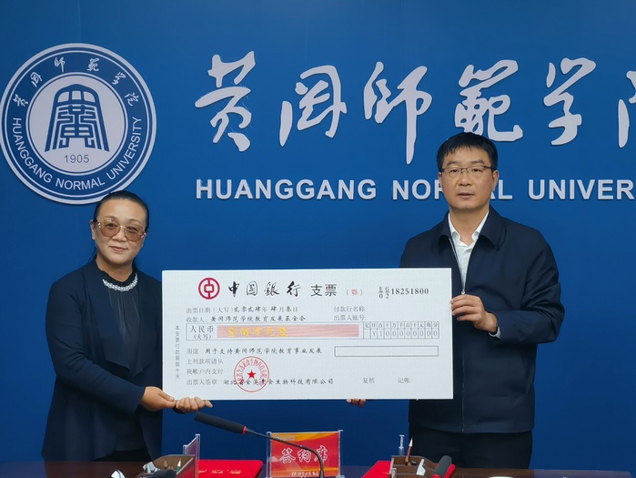 汪卫真和陈朝阳分别代表湖北省全莲素食生物科技有限公司、黄冈师范学院教育发展基金会签署了捐赠协议。