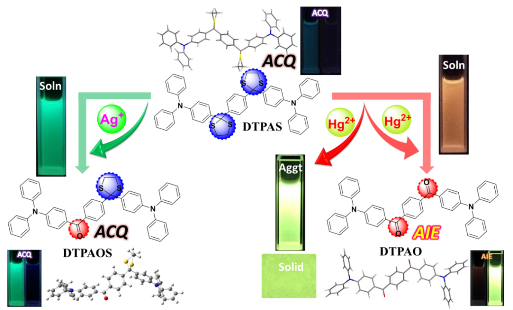 近年来,由于Hg2+和Ag+与硫的高亲和力,许多含硫受体的化学传感器相继在世界各地被广泛开发出来,但由于Ag+和Hg2+两种离子与含硫受体具有相似的反应活性,导致Ag+或Hg2+的存在通常会干扰对另一种离子的检测,因此设计一种巧妙的探针来区分二者之间的差异是目前行业内存在的普遍性难题。为探索制备一款智能的探针以实现不同信号输出,并同时选择性检测Hg2+和Ag+,我校阮志军教授团队经过长时间研究,精心设计了一种含有两个硫缩酮基团的荧光探针DTPAS,有效实现了Hg2+(红色荧光)和Ag+(绿色荧光)的双通道选择性“开启”检测。该项研究成果不仅为复杂系统中多种分析物的检测提供了一种有效的方法,也为化学传感器的设计提供了新的研究思路和解决平台。