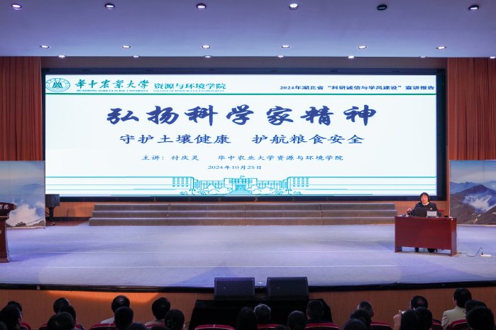 华中农业大学资源与环境学院副教授、省科协第十届委员会委员、湖北省土壤肥料学会理事付庆灵以《弘扬科学家精神——守护土壤健康,护航粮食安全》为主题作宣讲报告。宣讲中,付庆灵从党的二十届三中全会明确提出构建支持全面创新体制机制的政策要求入题,讲述了中国科学院院士陈华癸先生在学科建设、人才培养、科学研究等方面的生动事迹,详细诠释了中国科学家精神的内涵,并结合传承科学家精神讲述了自己的科研之路,以近年来学术不端事件为例,倡导科技工作者要敬畏科学、务实求真,坚持学术诚信,坚守底线思维。报告会后,付庆灵与参加活动人员进行了交流互动。