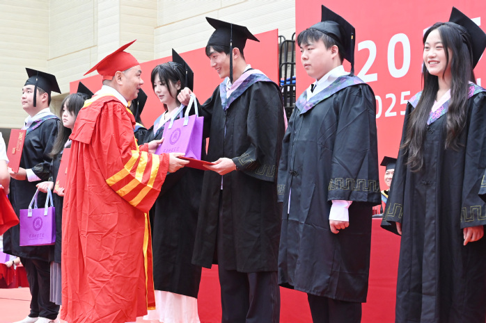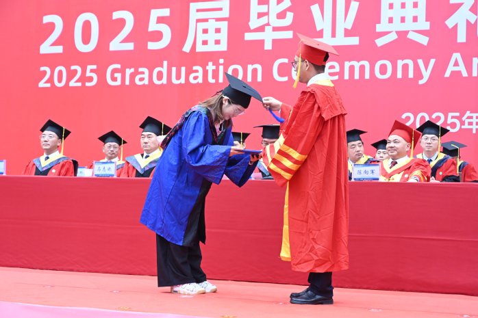身着学位服的毕业生依次上台,全体校领导、全体学位评定委员会委员为其逐一授予学位,拨穗正冠。