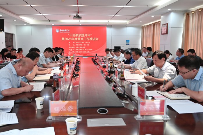 本网讯 为深入贯彻落实湖北“干部素质提升年”总体要求和工作部署,全面总结学校上半年工作,6月26日下午,学校召开2025年度重点工作推进会。校党委书记陈向军作总结讲话,校党委副书记、校长漆昌柱主持会议,全体在家校领导出席会议。