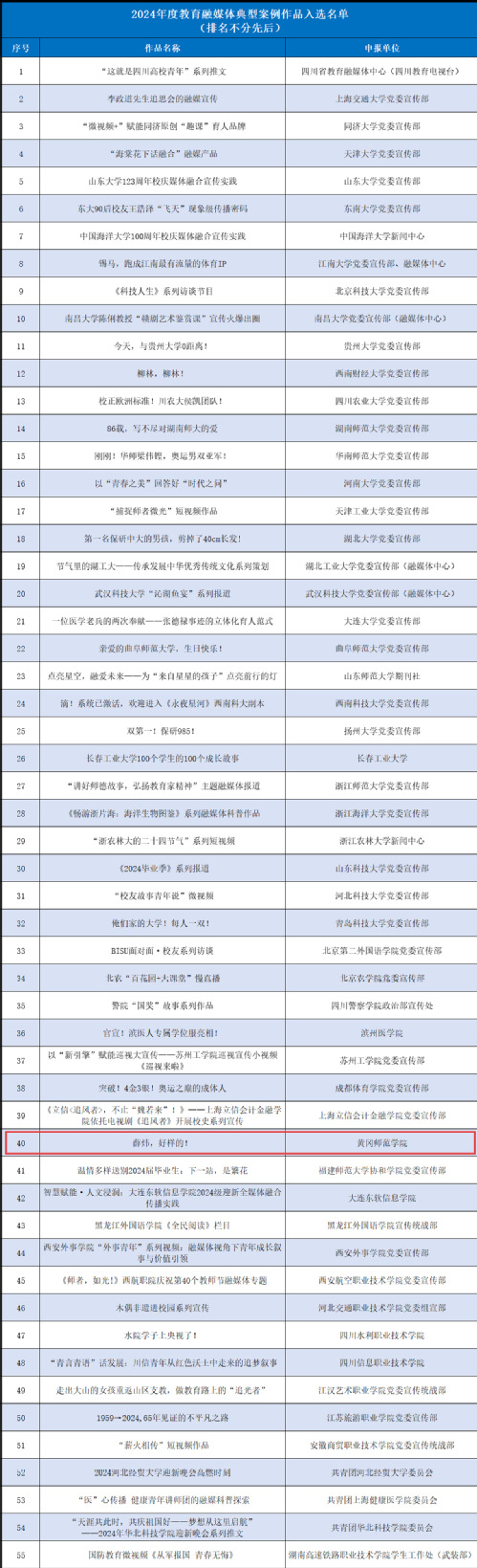 中华出版促进会教育新闻出版专业委员会和中国教育电视协会高校电视专业委员会于5月19日至6月20日共同开展了“2024年度教育融媒体典型案例作品、案例项目征集”活动,以全面梳理教育融媒体建设的年度成果,推广可复制、可借鉴的先进经验。活动受到广大教育新闻从业者的关注和参与,经专家严格审核与综合评议,入选55件典型案例作品。