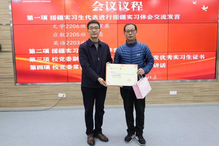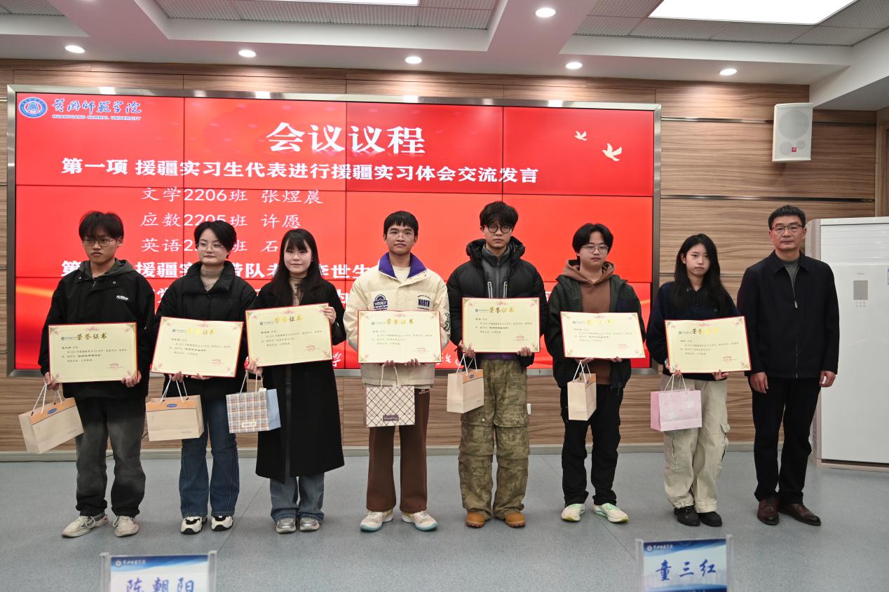 带队教师李世生总结了援疆教育实习工作中的宝贵经验;文学院(苏东坡书院)张煜晨、数学与统计学院许愿、外国语学院石叶三位同学分享了援疆实习的感悟与收获。
