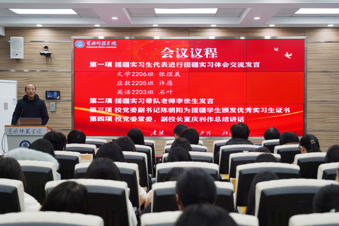 本网讯 12月18日,我校在北校区求实楼举行2025年师范生援疆实习暨教师情怀分享会。校党委副书记陈朝阳,党委常委、副校长夏庆利出席会议。