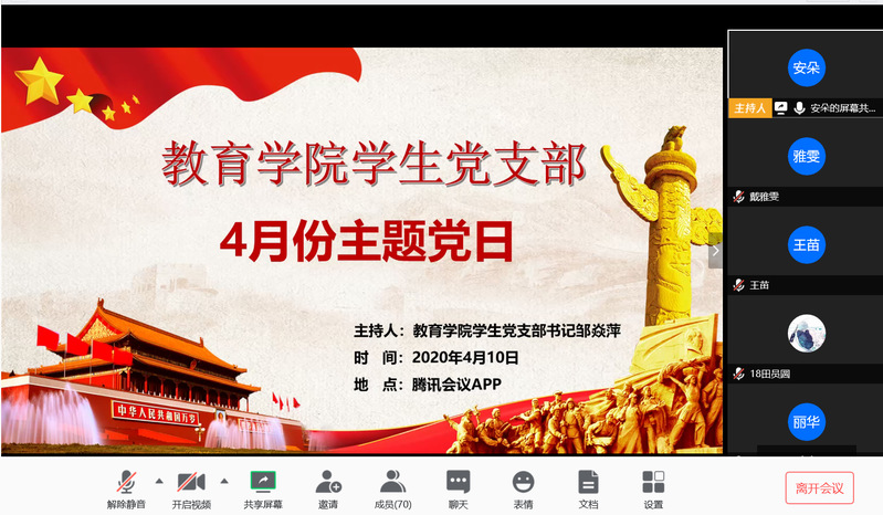 4月10日下午,我院学生党支部借助视频会议举行了4月支部主题党日线上学习活动。会议由学生党支部书记邹焱萍老师主持,党总支副书记胡周友老师出席,全体学生党员参加了会议。