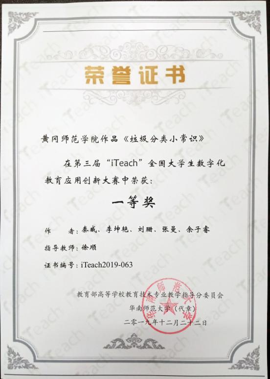 现代教育技术专业硕士研究生秦威获得第三届“iTeach”全国大学生数字化教育应用创新大赛一等奖