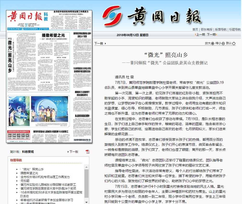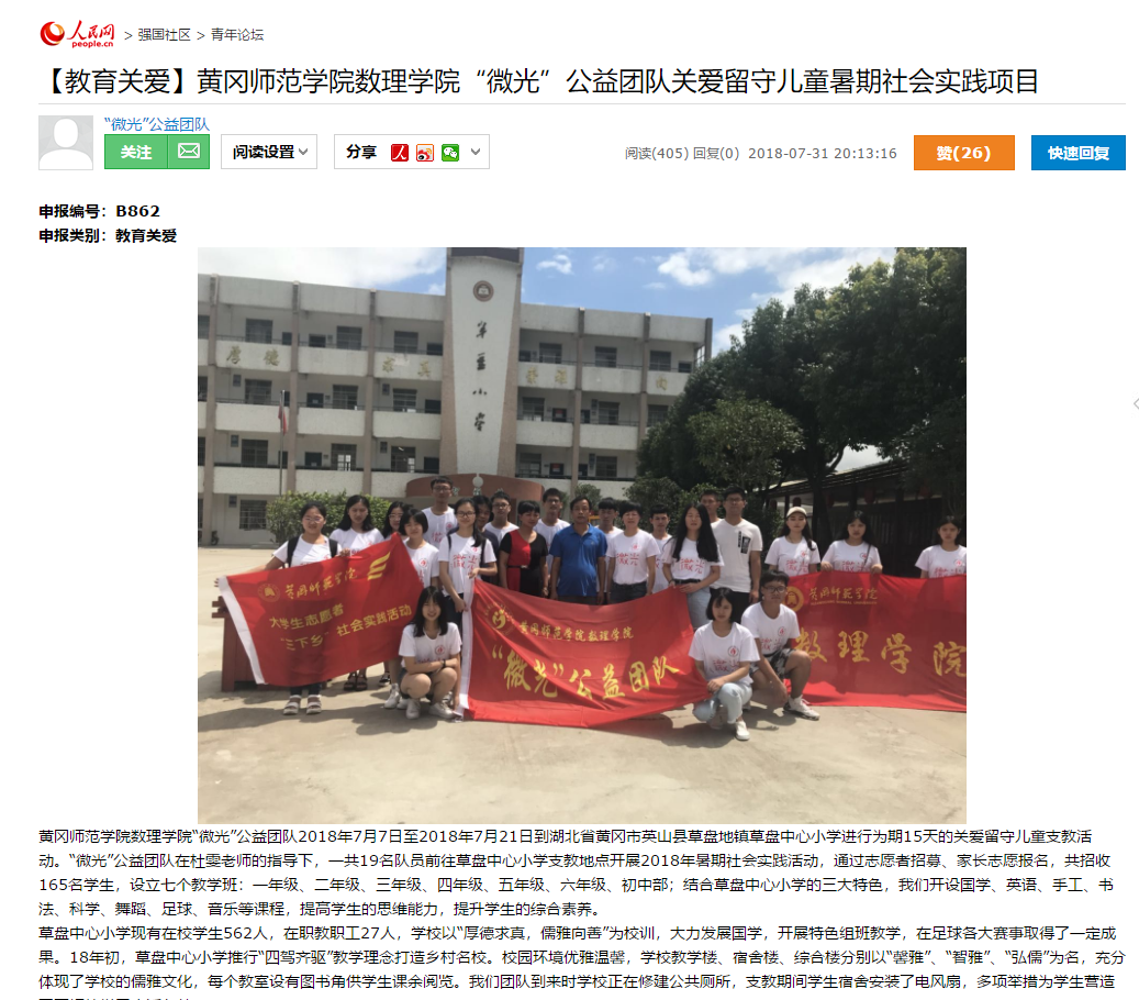 活动受到了当地政府、学校与社会各界的广泛好评,展现了我院青年大学生积极投身社会实践、志愿服务的良好精神风貌和社会责任感,为实施“五个思政”打造“大思政”品牌、传承红色文化、锤炼意志品质、服务奉献社会贡献青春力量。“微光”公益支教团队的志愿服务事迹得到了人民网、新农村商报网、黄冈日报头版头条等多家媒体的报道,同武汉大学等高校团队一起被评为2018年湖北省大中专学生志愿者暑期“三下乡”社会实践活动“优秀团队”。