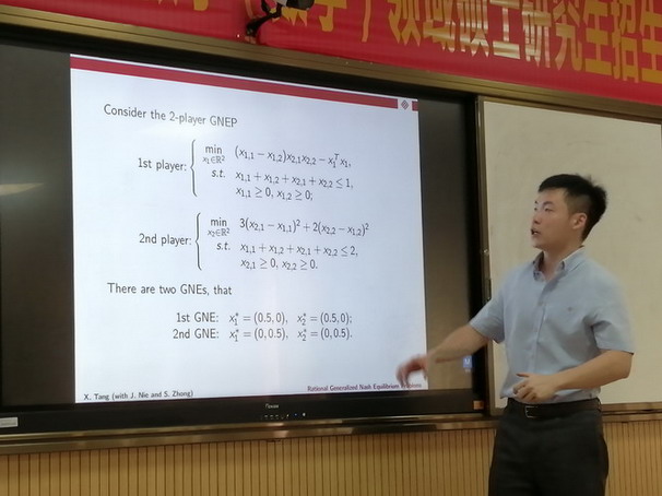 唐新东博士报告题目是《有理广义纳什均衡问题 (Rational generalized Nash equilibrium problems)》。他首先详细说明了经典纳什均衡问题与广义纳什均衡问题在可行集及其凸性等方面的区别和联系。接着,就目标函数和约束条件函数均为有理函数的有理广义纳什均衡问题,介绍了由有理函数定义的广义纳什均衡问题和基于拉格朗日乘子表示及矩-平方和半定松弛的均衡求解算法(KKT-SDP),并通过数值计算实例将KKT-SDP算法与经典的内点法、拟变分不等式法、增广拉格朗日乘子法、高斯-赛德尔迭代法计算结果在迭代速度和结果精度方面进行了分析比较,展现了KKT-SDP算法的优越性。最后,就广义纳什均衡问题的可行集拓展、KKT条件失效、局部最优等方面作了研究展望。